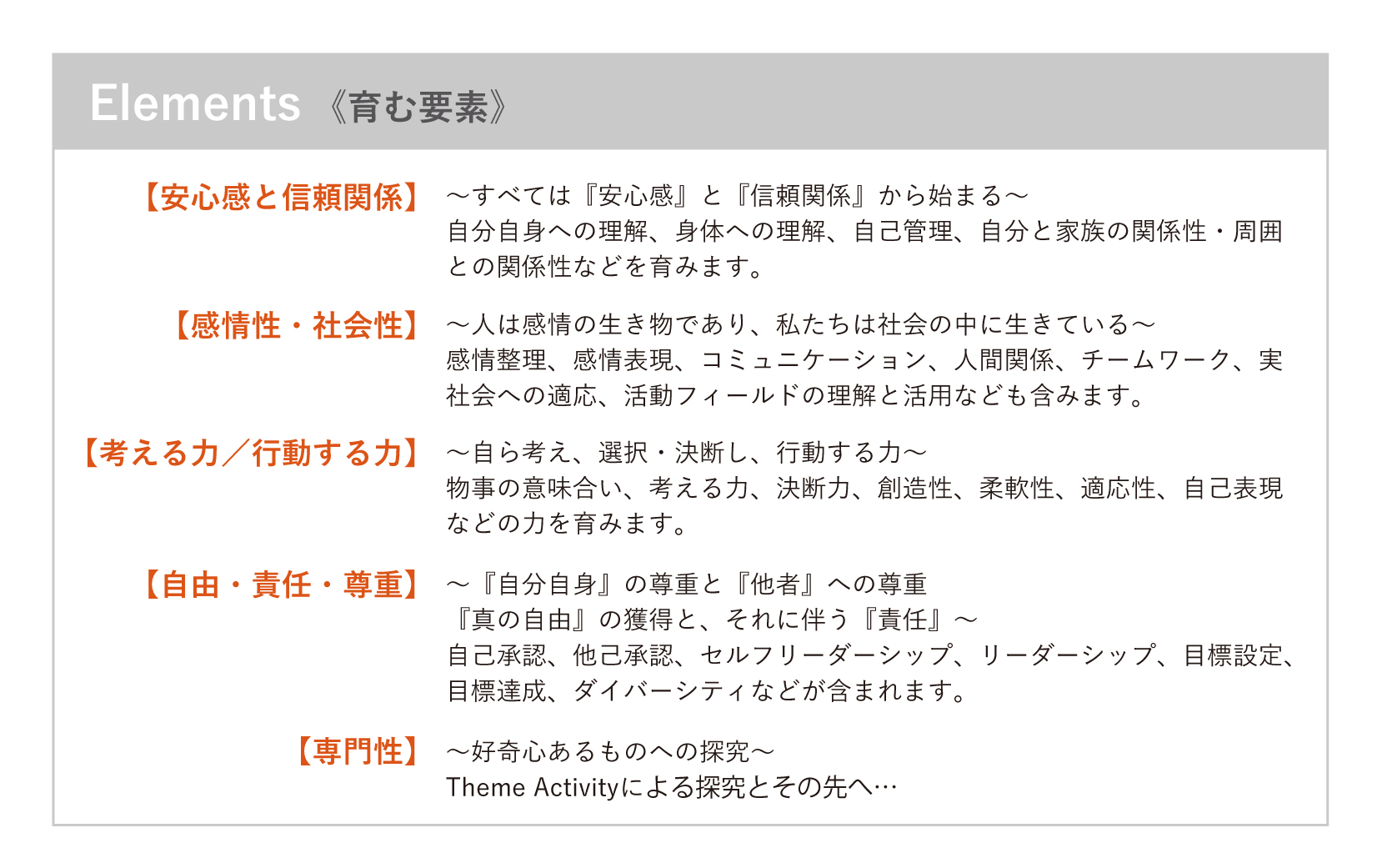 FISでは、学びの環境を通じて、子どもたちが自己実現のための必要な Elements(要素) を育み
