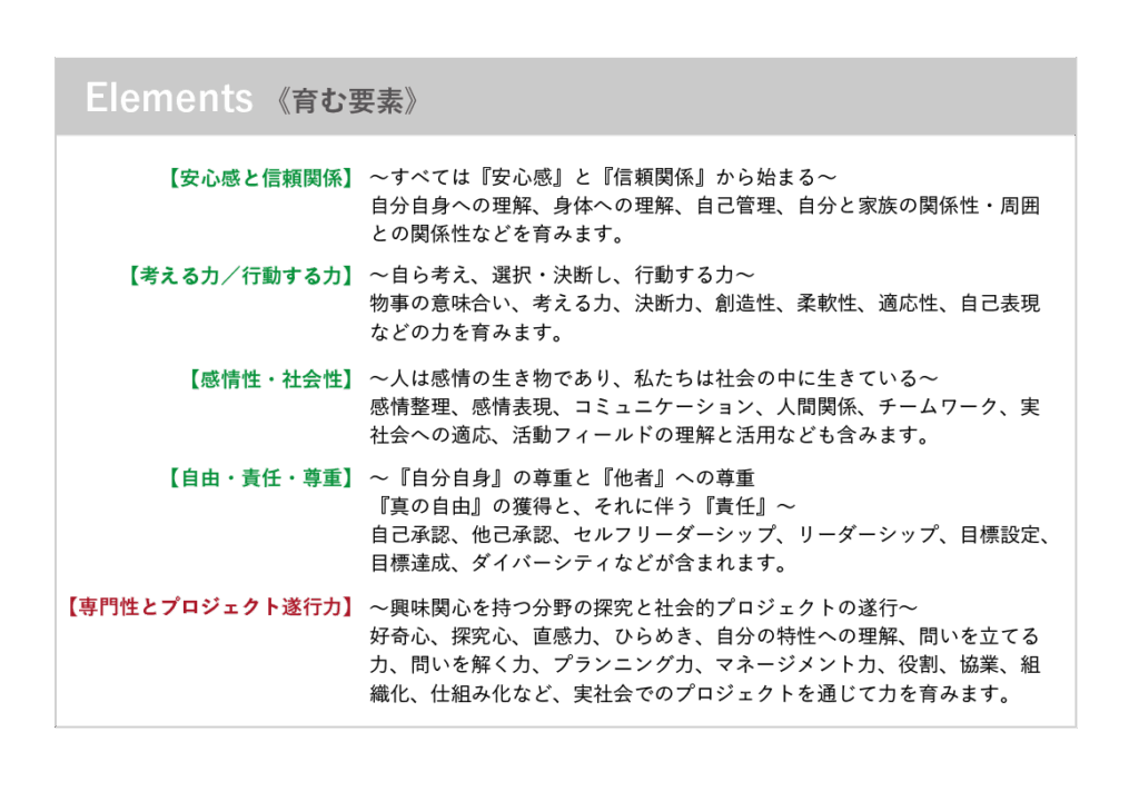 以下のElements(要素) は、FISの学びの指針でもあり、これらを深めることにより「自己実現」のための「必要な力」を高めていきます。
